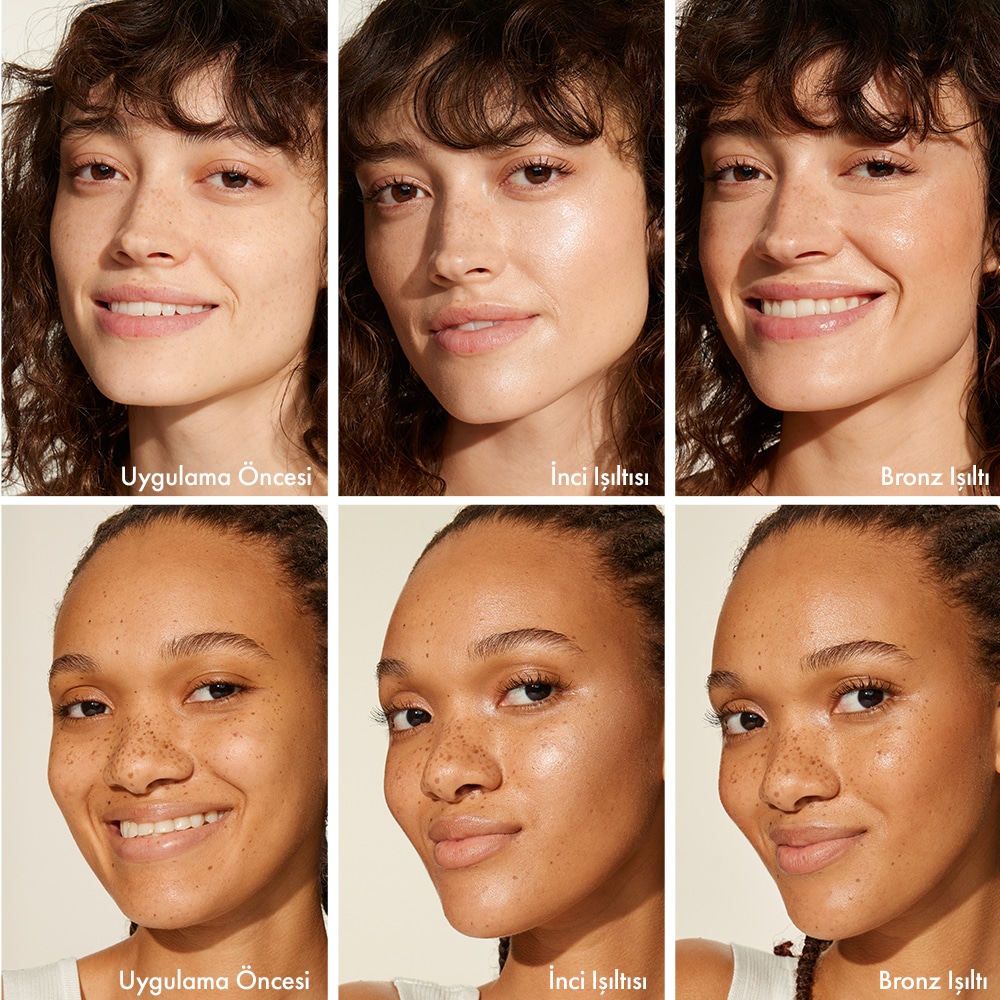 Işıltılı jel nemlendiricimiz, Bronz Işıltı ve yeni İnci Işıltısı renkleriyle anında ışıltı ve nemlendirme sağlar.